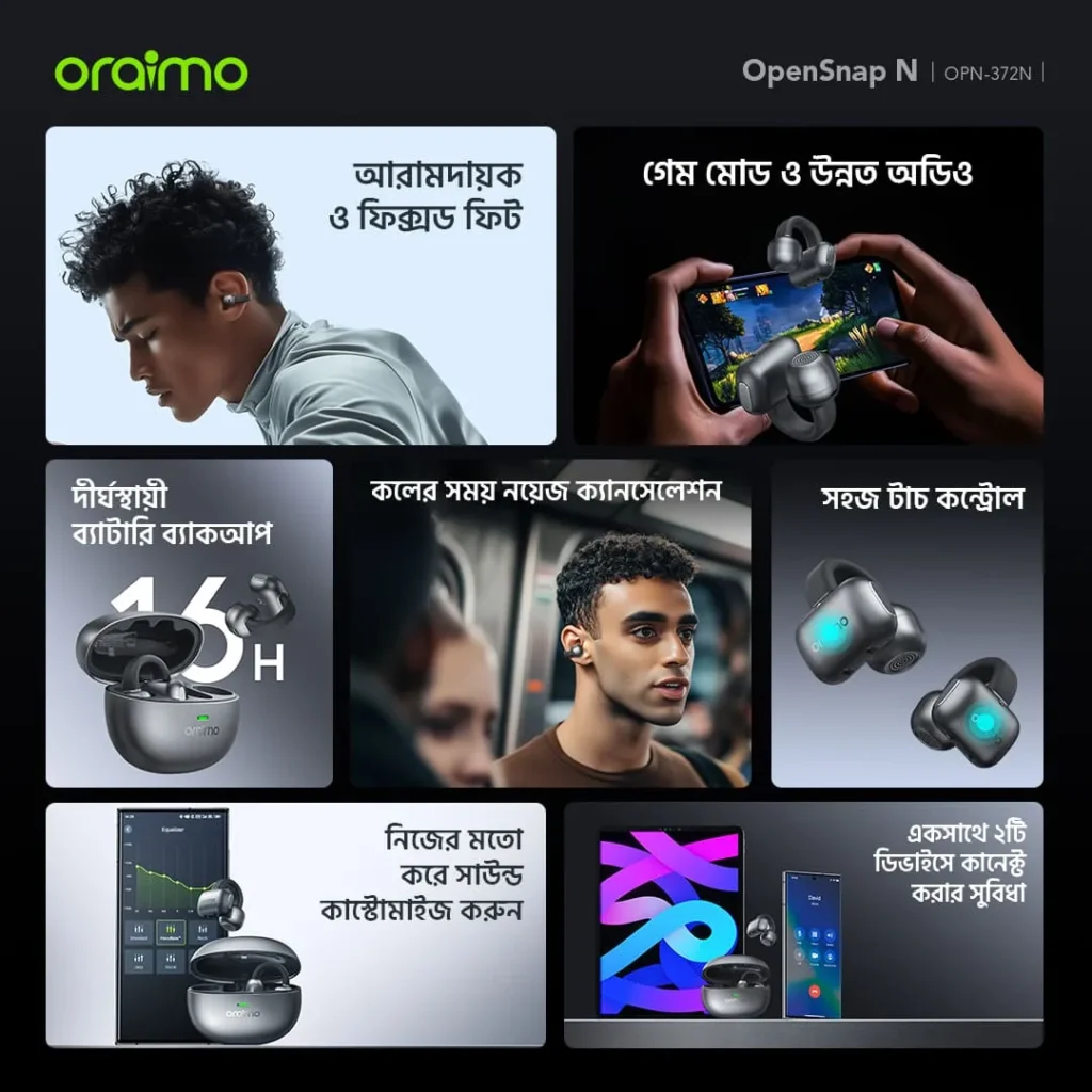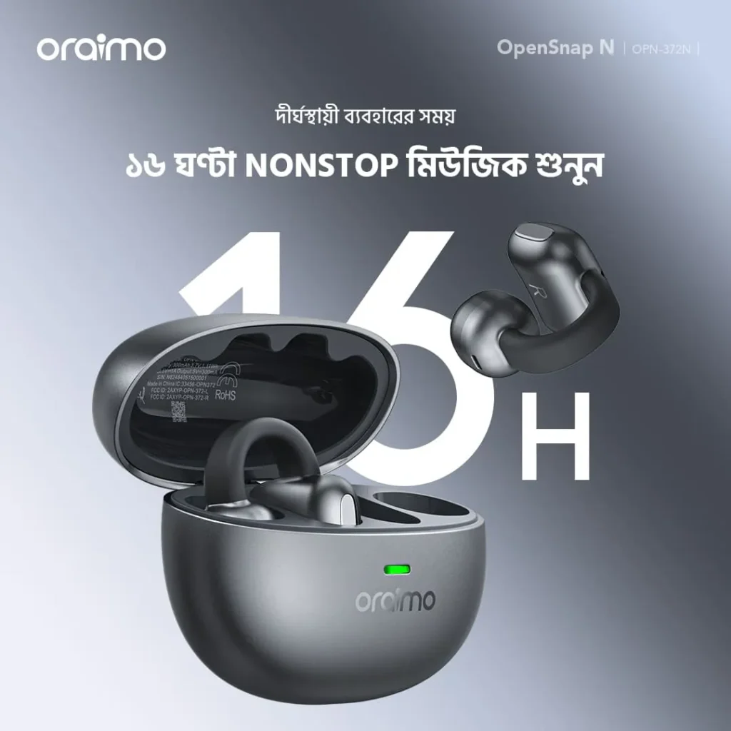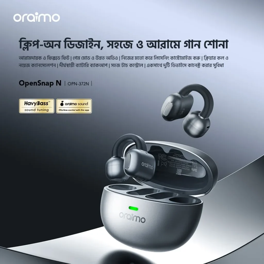 কানে হেডফোন দিয়ে দীর্ঘক্ষণ কাজ করলে বা ব্যায়াম করলে অস্বস্তি বা ব্যথা অনুভব করেন? চারপাশের পরিবেশ থেকে পুরোপুরি বিচ্ছিন্ন হয়ে যাওয়ায় নিরাপত্তাহীনতায় ভোগেন? Oraimo নিয়ে এসেছে এর বিপ্লবী সমাধান OpenSnap N Open-Ear Earbuds। এর ইউনিক ক্লিপ-অন ডিজাইন আপনার কানকে পুরোপুরি খোলা রেখে দেয় আরামদায়ক এবং নিরাপদ এক অডিও অভিজ্ঞতা। এখন মিউজিক এবং পারিপার্শ্বিক সচেতনতা চলবে একসাথেই।