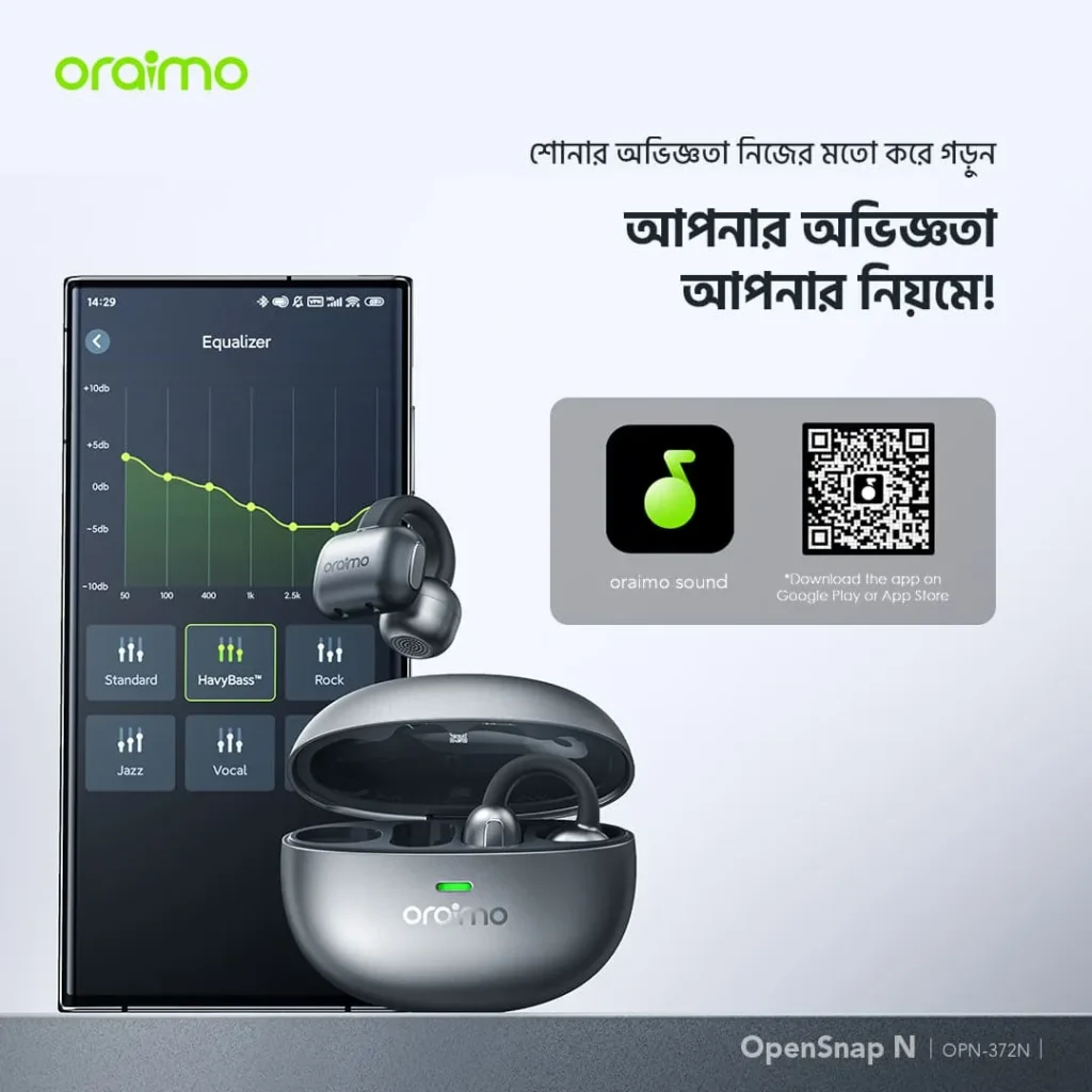 - Customizable Music Experience: Oraimo Sound App ব্যবহার করে টাচ কন্ট্রোল এবং সাউন্ড নিজের মতো করে সাজিয়ে নিন। বেস (bass) বাড়ান, ভোকাল (vocals) পরিষ্কার করুন এবং আপনার নিজস্ব স্টাইলে গান উপভোগ করুন।