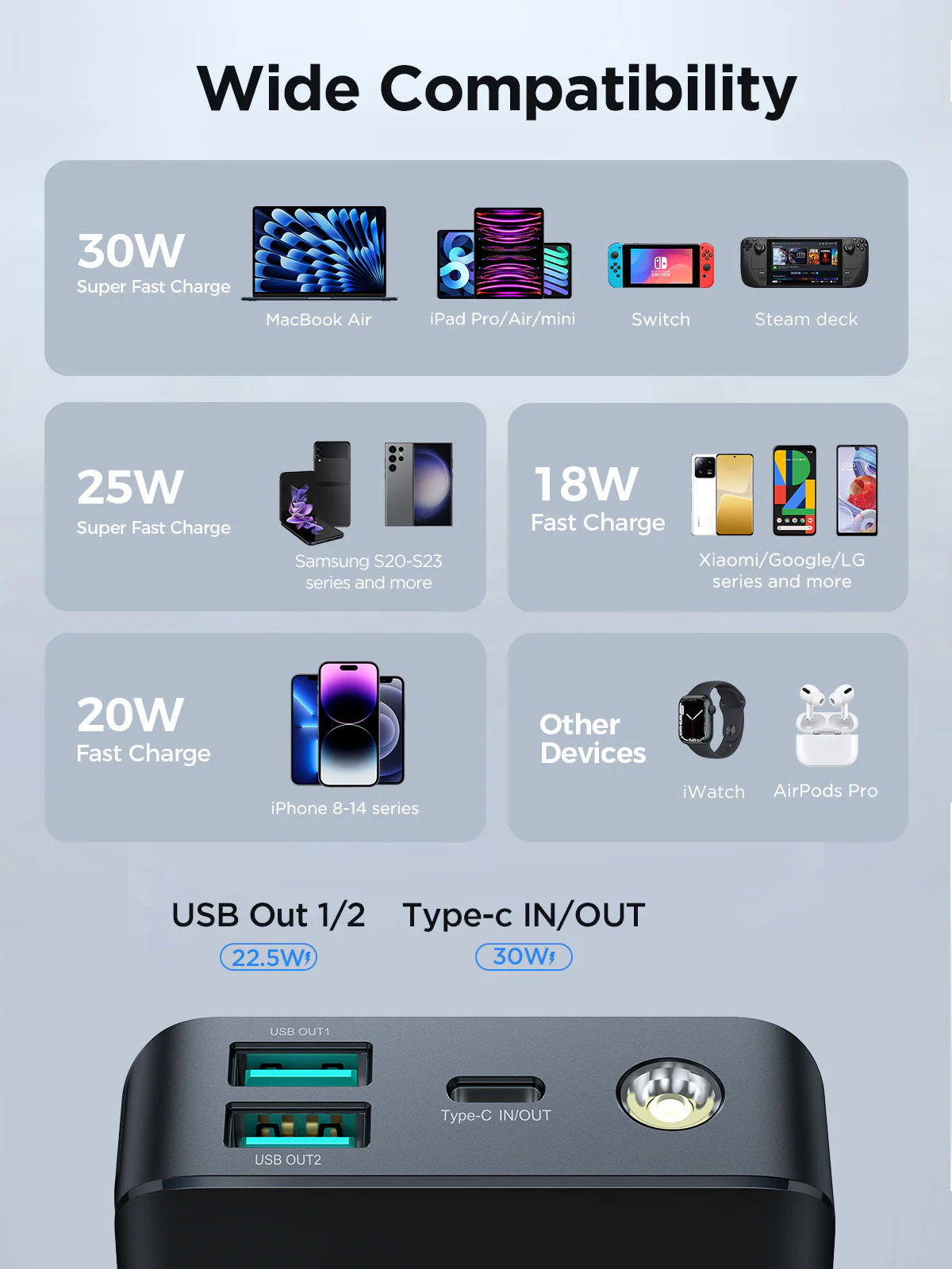 সকল ডিভাইসের জন্য একটিই সমাধান: আপনার ডিভাইসটি Apple, Samsung, Huawei বা Xiaomi যা-ই হোক না কেন, এই পাওয়ার ব্যাংকটি প্রায় সব ধরনের ফাস্ট চার্জিং প্রটোকল (PD3.0, QC3.0, SCP) সাপোর্ট করে। এটি আপনার সব ডিভাইসের জন্য একটি পারফেক্ট অল-রাউন্ডার।